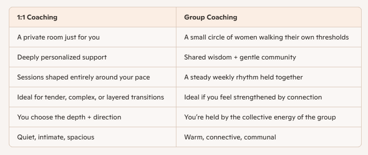 1:1 Coaching — deeply personalized, spacious, and attuned to your pace